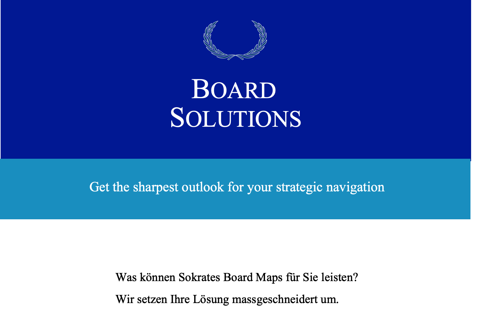 Sokrates Board Solutions sind präzise "Forward Looking Dashboards" (bestehend aus SokratesMaps), welche die Arbeit von Verwaltungsrat und Geschäftsleitung enorm unterstützen. Der Blick in die Zukunft und die Interpretation von unerwarteten Ereignissen wird durch die planartige Darstellung der Zusammenhänge möglich. Entscheidungsoptionen und deren Wirkungen lassen sich mit Pfeilen vergleichsweise einfach einschätzen. Sokrates Board Solutions fördern die richtigen Fragestellungen und stärken das Strukturwissen der Anwender. Die Maps dienen dann als verlässliche Kommunikations-, Konversations- und Kommando-Instrumente und helfen dabei, besser zuzuhören und genauer hinzuschauen.