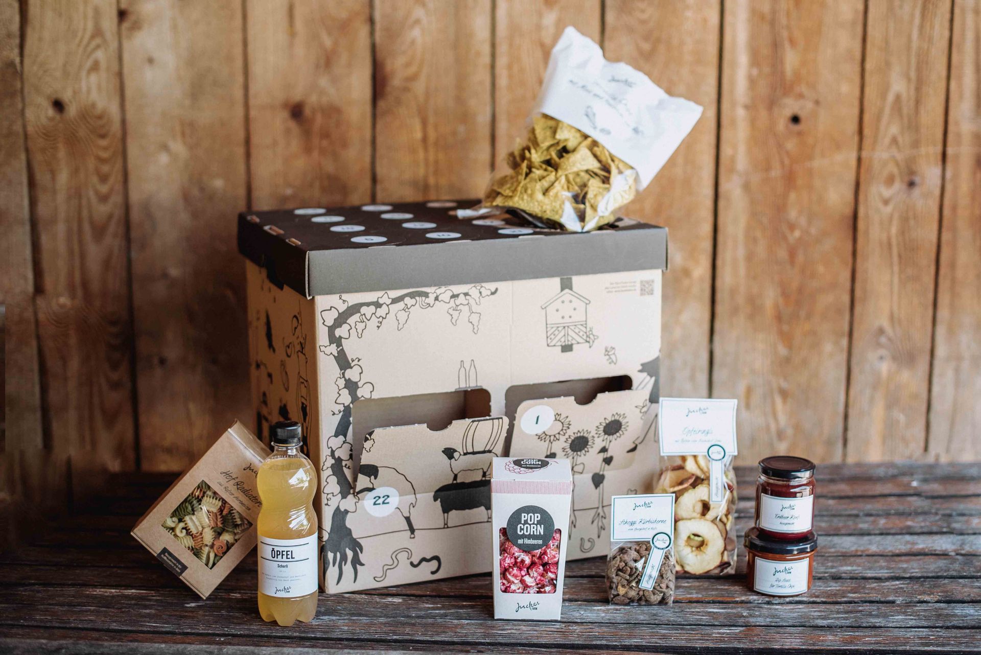 Die meisten Produkte des Adventskalenders sind alle auch in den Jucker Farm Hofläden erhältlich. Sie werden in unserer HofManufaktur auf dem Bächlihof in Jona hergestellt, aus eigens angebauten Rohstoffen. Alle Produkte sind in Originalgrösse im Kalender drin (keine Mini-Versionen). Zudem haben wir den Kalender um einige tolle weihnachtliche Produkte von Partnerbetrieben ergänzt: Taucherli Schoggi, Bäckerei Guggenloch und Heimatwerk Züri Oberland.