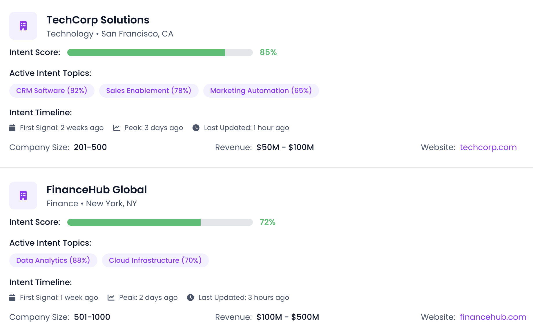 Ihr seht in Echtzeit, welche Firmen sich intensiv mit den Themen beschäftigen, die ihr als Lösung anbietet: